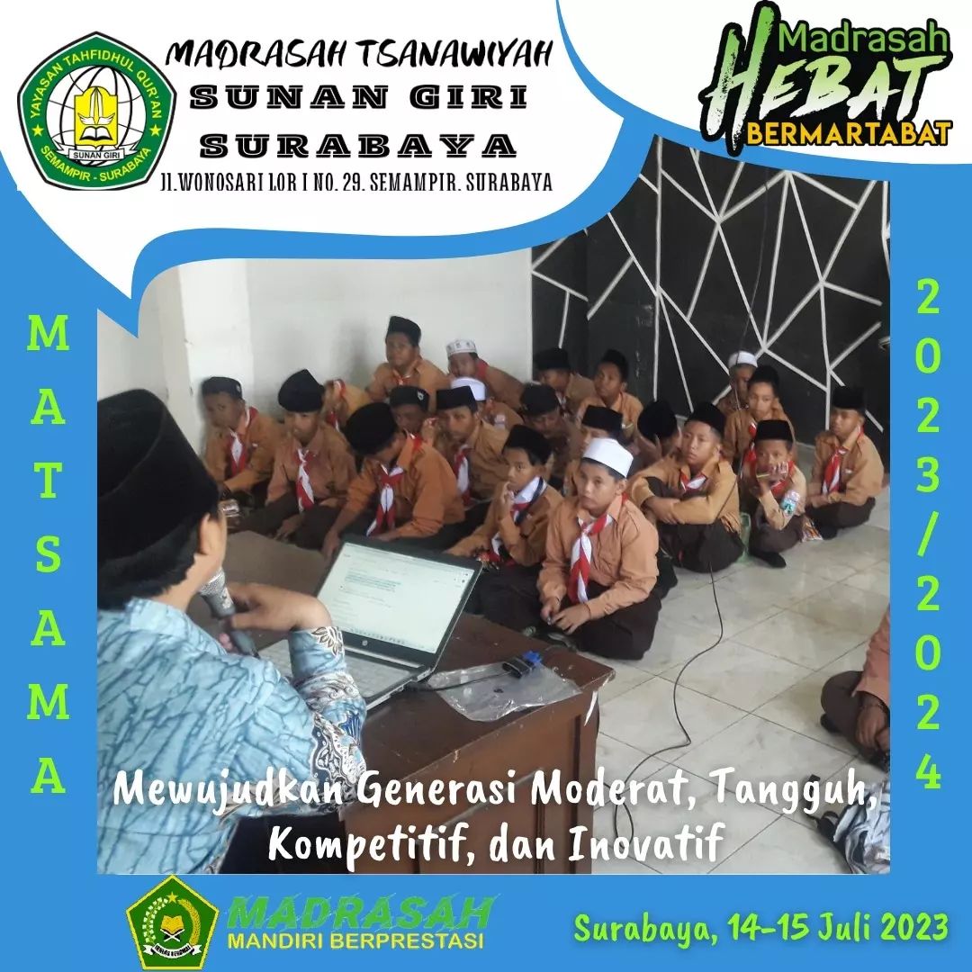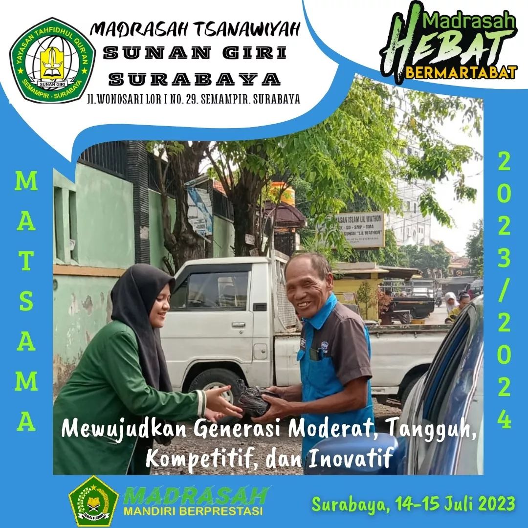 Hari Kedua Kegiatan Masa Ta'aruf Siswa Madrasah (MATSAMA) Tahun ajaran 2023-2024 siswa-siswi MTs Sunan Giri Surabaya. dan Kegiatan Bakti Sosial kepada masyarakat sekitar madrasah yang dilakukan oleh siswa baru kelas VII MTs Sunan Giri dan dibantu oleh anggota OSIM