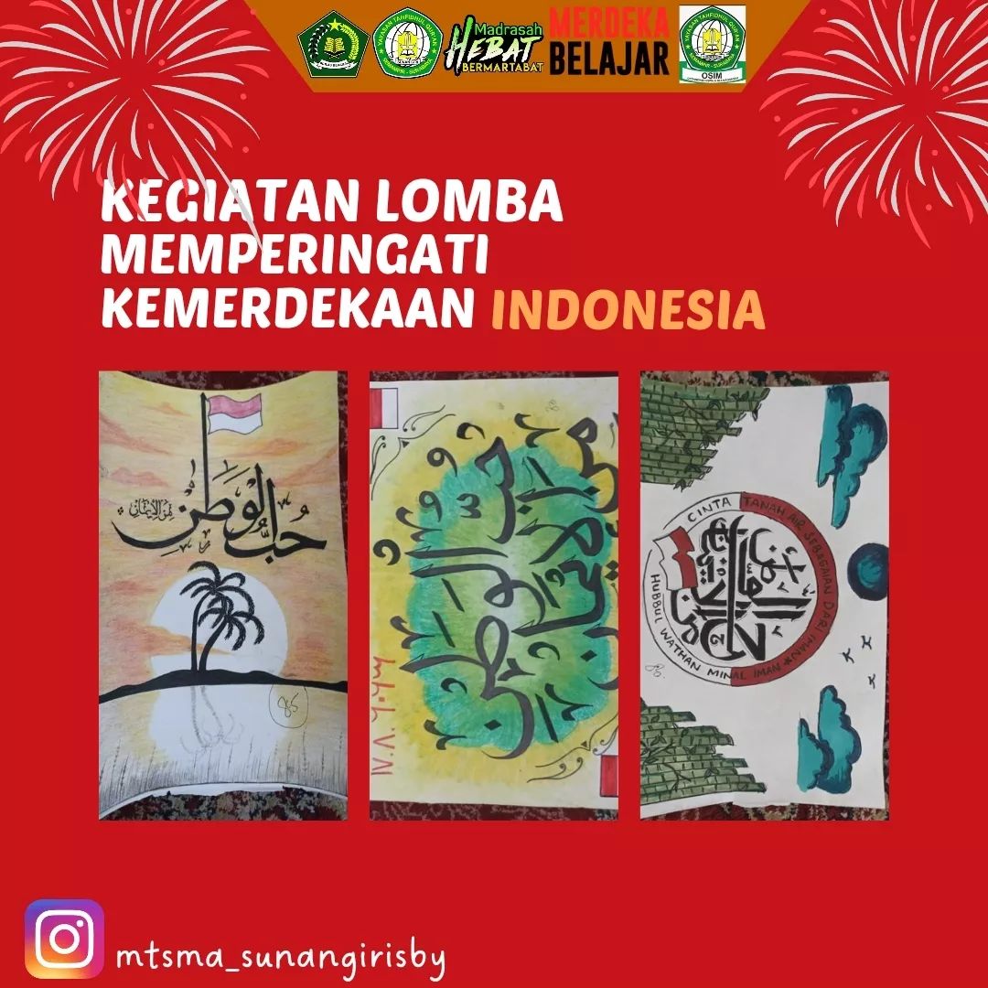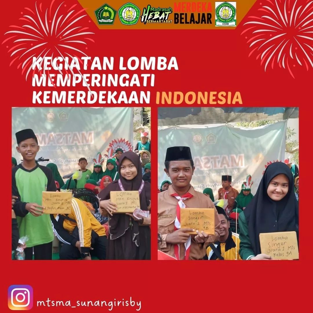 Dalam memperingati hari Kemerdekaan Indonesia. Madrasah mengadakan kegiatan dengan beberapa lomba guna melatih sportifitas dan mengasah bakat anak anak, yakni dengan lomba makan kerupuk, menyanyi (grup/solo), membuat kaligrafi. Selamat untuk para pemenang lomba dan tetap semangat bagi kalian yang masih belum menjadi pemenang. Tetap gali dan asah potensi bakat kalian